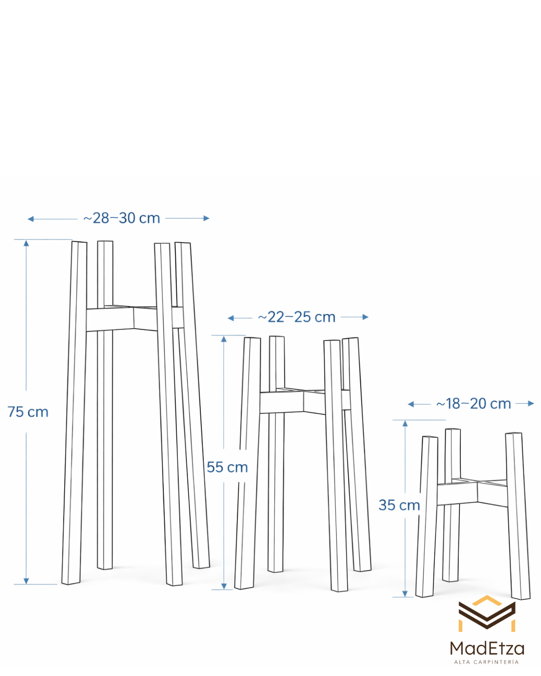 Este kit de porta macetas en madera sólida de encino ofrece un diseño sobrio y elegante, ideal para espacios que buscan una estética limpia y contemporánea. El encino aporta resistencia, estabilidad y una apariencia uniforme que se adapta a ambientes modernos y profesionales.