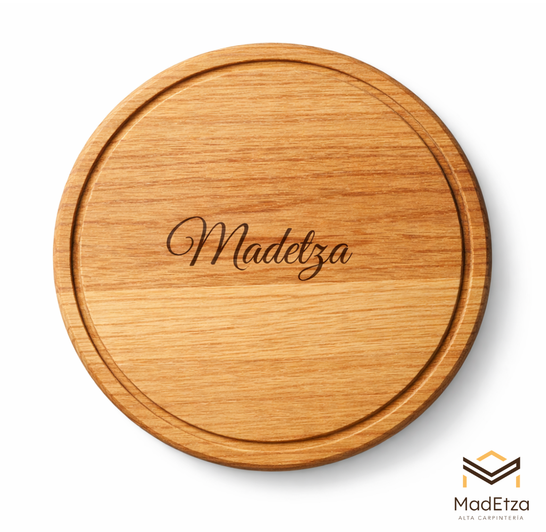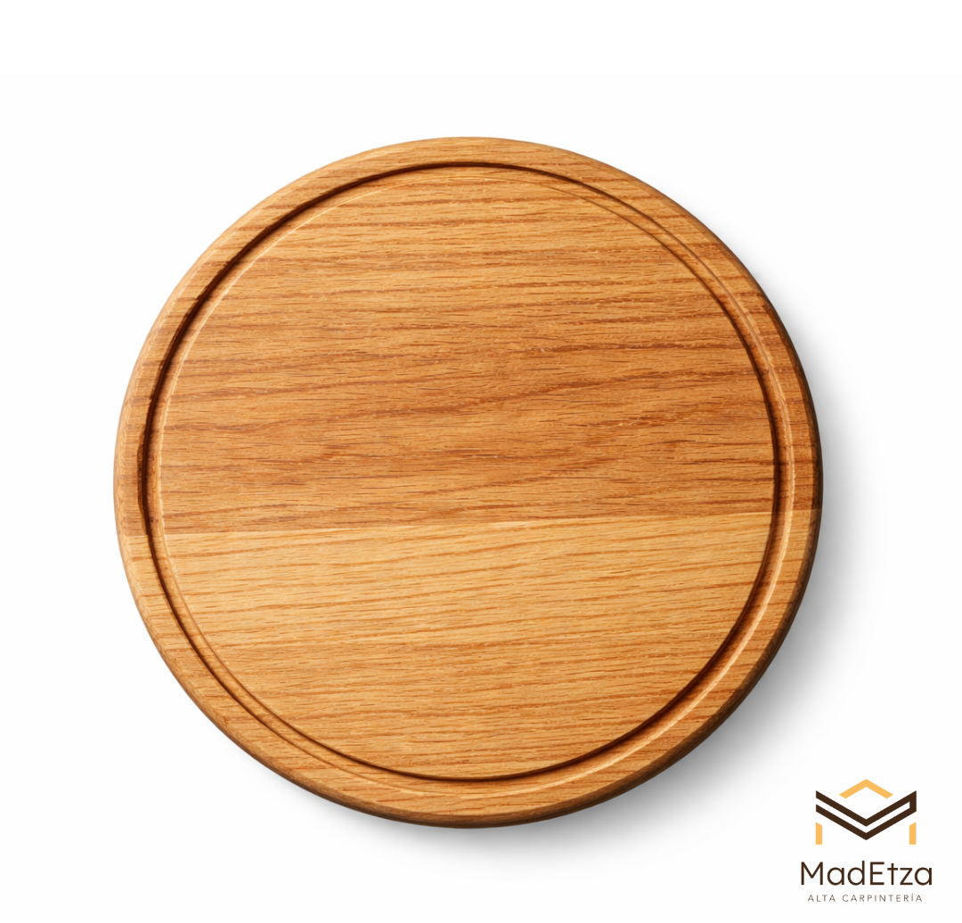Esta tabla circular de encino es ideal para restaurantes, hoteles y mesas gastronómicas que buscan una presentación equilibrada y elegante. Su forma permite una distribución visual atractiva de alimentos.