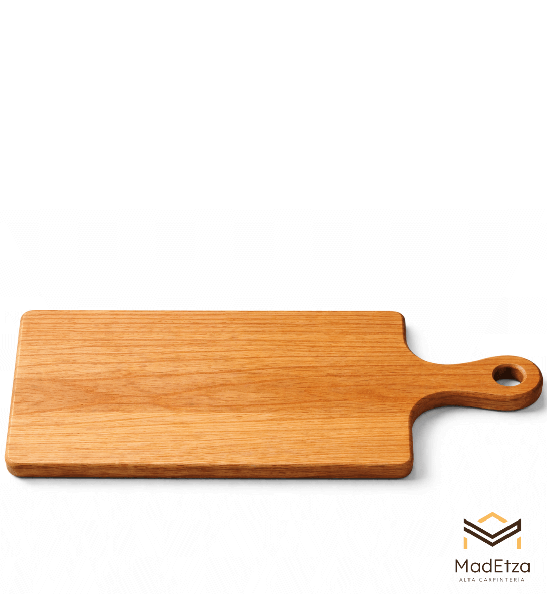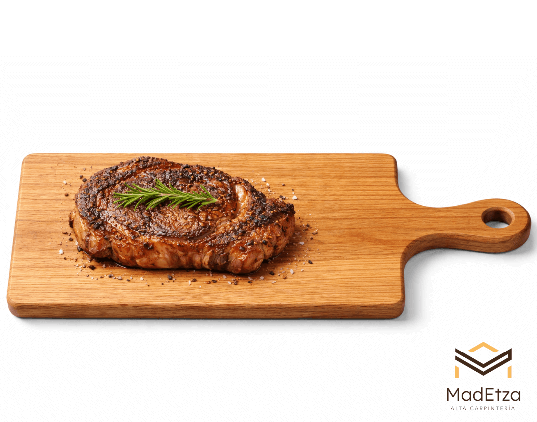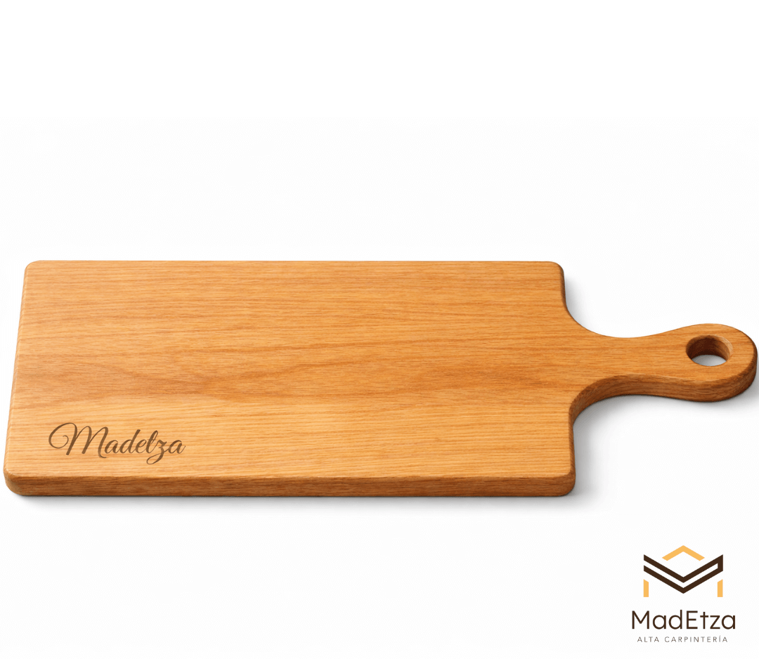 Esta tabla de encino con mango está diseñada para facilitar el servicio en restaurantes, hoteles y eventos gastronómicos. El mango permite un manejo cómodo y una presentación limpia y profesional.