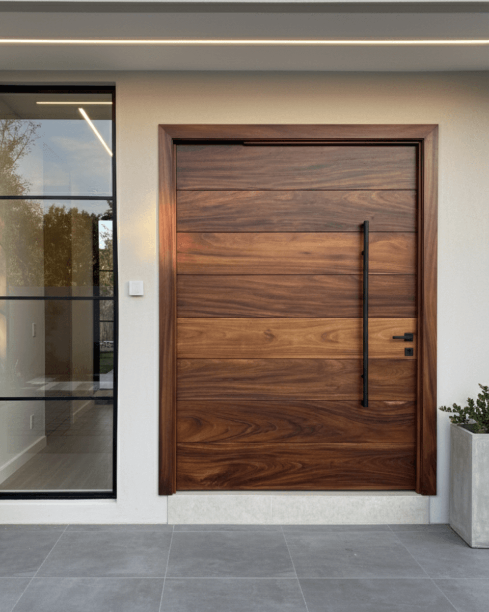 Puertas diseñadas para la entrada principal de viviendas que buscan una estética elegante y natural.